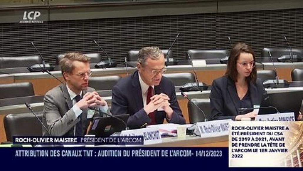 La commission d'enquête sur l'attribution, le contenu et le contrôle des fréquences de TNT auditionne Roch-Olivier Maistre, président de l'Autorité de régulation de la communication audiovisuelle et numérique (Arcom). Cette commission, créée à la demande des députés de La France insoumise au titre du pouvoir de contrôle des oppositions, cherche à faire la lumière sur les procédures d'attribution des autorisations de services de télévision à caractère national sur la TNT ». Les autorisations de diffusion sur la télévision numérique terrestre de 15 des 30 chaînes qui sont présentes arrivent à échéance en 2025. Retrouvez cette audition en intégralité sur LCP Assemblée nationale.