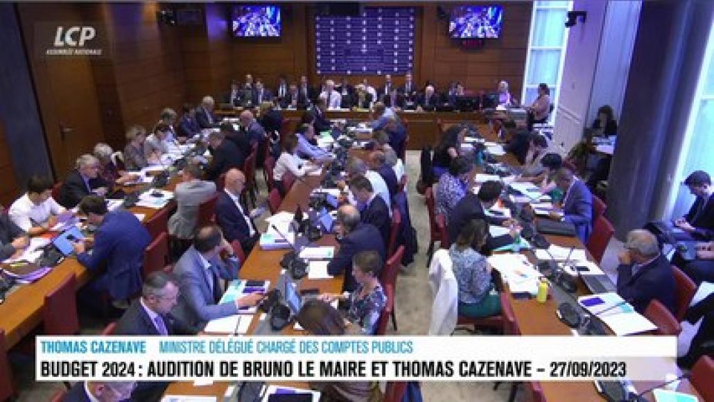 La commission des Finances de l'Assemblée nationale auditionne Bruno Le Maire et Thomas Cazenave, nouveau ministre des Comptes publics, sur le projet de budget pour 2024, présenté en conseil des ministres ce 27 septembre. Cette audition marque le début du marathon budgétaire, les parlementaires ayant un temps limité pour voter la prochaine loi de finances. Cette année, le gouvernement ambitionne de redresser les finances publiques en ralentissant les dépenses et en investissant dans la transition écologique. Une séance à revoir en intégralité sur LCP Assemblée nationale.