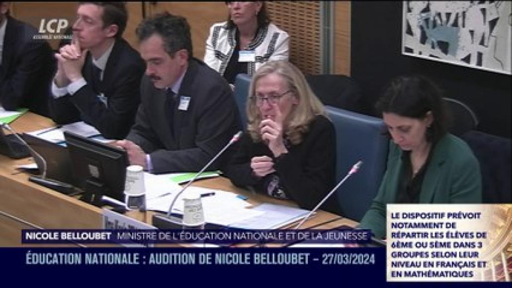 Première audition à l'Assemblée nationale pour la nouvelle ministre de l'Education nationale et de la Jeunesse du gouvernement Attal, nommée le 8 février. Ancienne garde des Sceaux du gouvernement d'Edouard Philippe (2017-2020), Nicole Belloubet est entendue par les députés de la commission des Affaires culturelles et de l'éducation. Lors de cette audition, la ministre dévoilera sa feuille de route et les priorités de son action. Elle sera notamment chargée de mettre en place le "choc des savoirs", la politique souhaitée par Emmanuel Macron et Gabriel Attal, qui instaure notamment des groupes de niveau au collège. Retrouvez l'intégralité de cette audition sur LCP Assemblée nationale.
