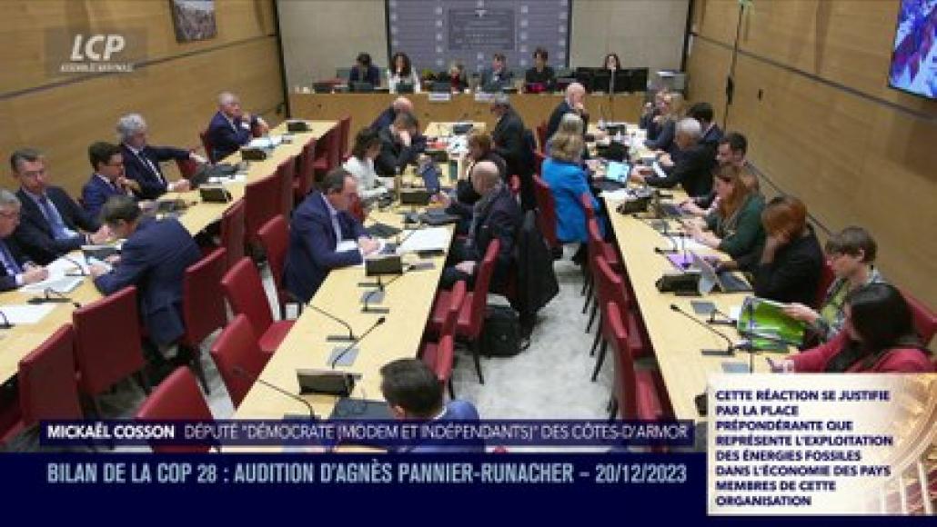 Les députés membres de la commission du développement durable auditionnent Agnès Pannier-Runacher, ministre de la transition énergétique, sur le bilan des négociations lors de la 28e Conférence des Parties à la convention-cadre des Nations Unies sur les changements climatiques (COP 28). Le 13 décembre, après deux semaines de négociations, près de 200 pays présents à Dubaï ont trouvé un accord historique. Adopté à l'unanimité, le texte mentionne pour la première fois l'objectif d'une sortie des énergies fossiles. Une audition à retrouver en intégralité sur LCP Assemblée nationale.