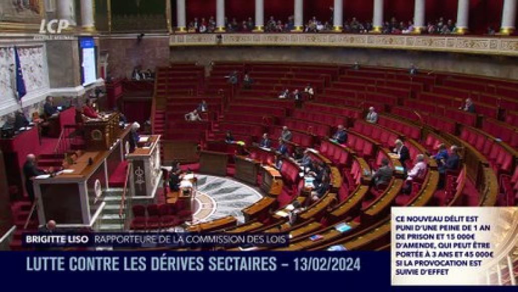 L'Assemblée nationale examine ce mardi 13 février, un projet de loi pour "renforcer la lutte contre les dérives sectaires". Le texte du gouvernement vise à tenir compte des évolutions constatées ces dernières années en matière de dérives sectaires, notamment le phénomène de « gourous 2.0 », qui fleurissent dans le domaine de la santé et du bien-être. Le projet de loi prévoit deux délits, celui de placement dans un état de « sujétion psychologique et physique » et celui de « provocation à l'abandon d'un traitement médical », dispositions supprimées par le Sénat. Retrouvez la discussion générale en séance publique sur LCP Assemblée nationale.