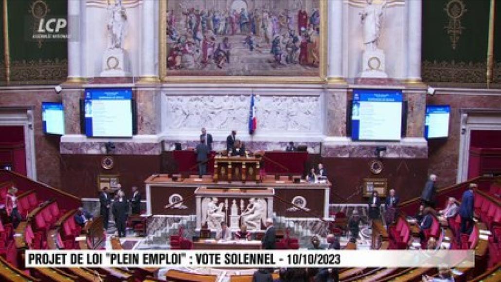 Le projet de loi « plein emploi », dont la discussion s'est achevée dans l'hémicycle mardi 4 octobre, est soumis au vote solennel de l'Assemblée nationale. Au coeur du texte, le nouveau contrat d'engagement pour les bénéficiaires du RSA a suscité des débats intenses en séance. Les députés de la majorité présidentielle ont voté en faveur d'un amendement LR qui impose aux bénéficiaires du RSA un minimum de 15 heures d'activité obligatoires par semaine, tout en prévoyant des exceptions possibles pour les parents isolés sans solution de garde, ou pour les personnes handicapées. Le projet de loi ambitionne de réduire le chômage autour de 5% d'ici 2027. Et ce texte est adopté par 351 voix pour et 251 vois contre.